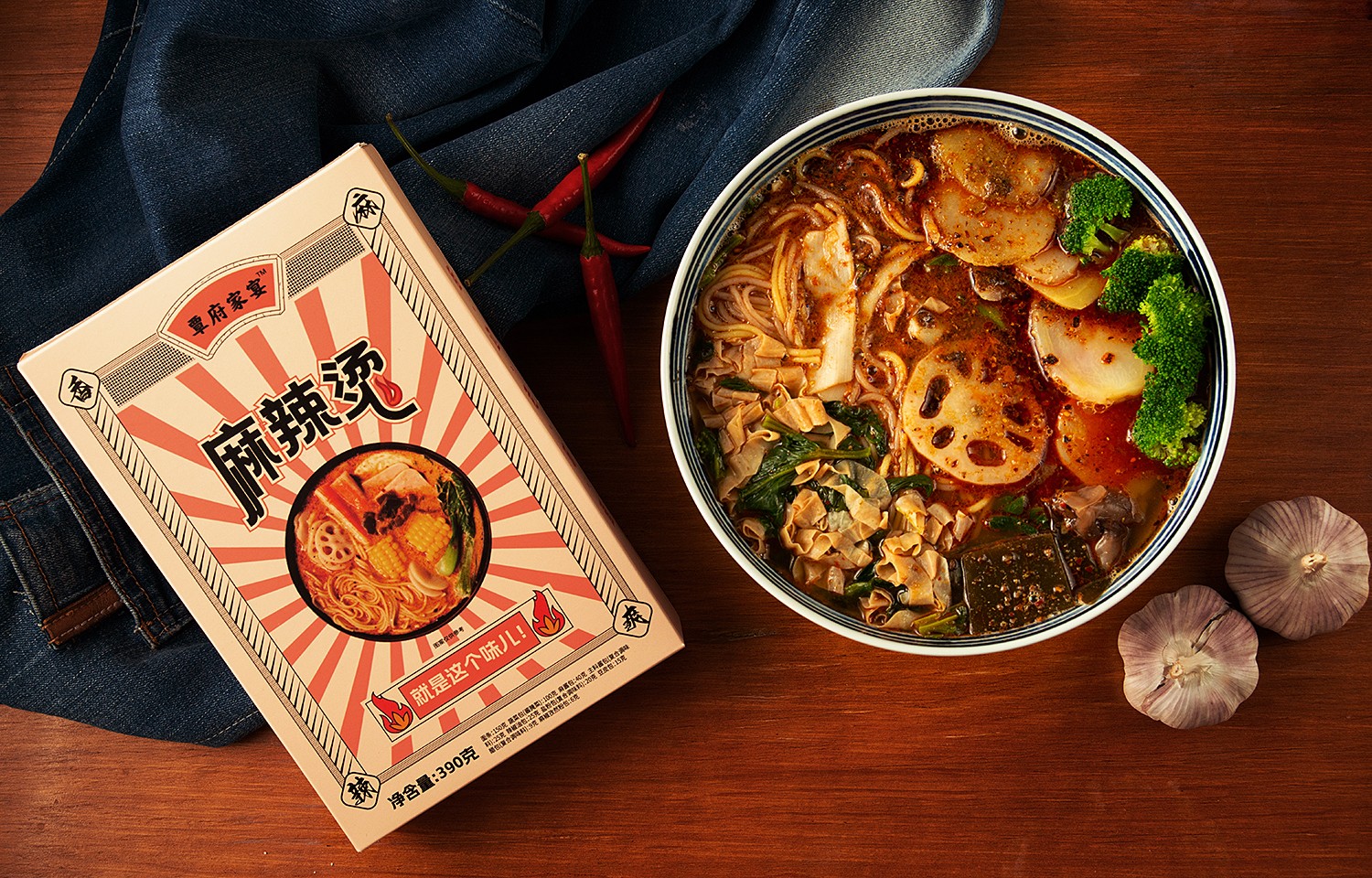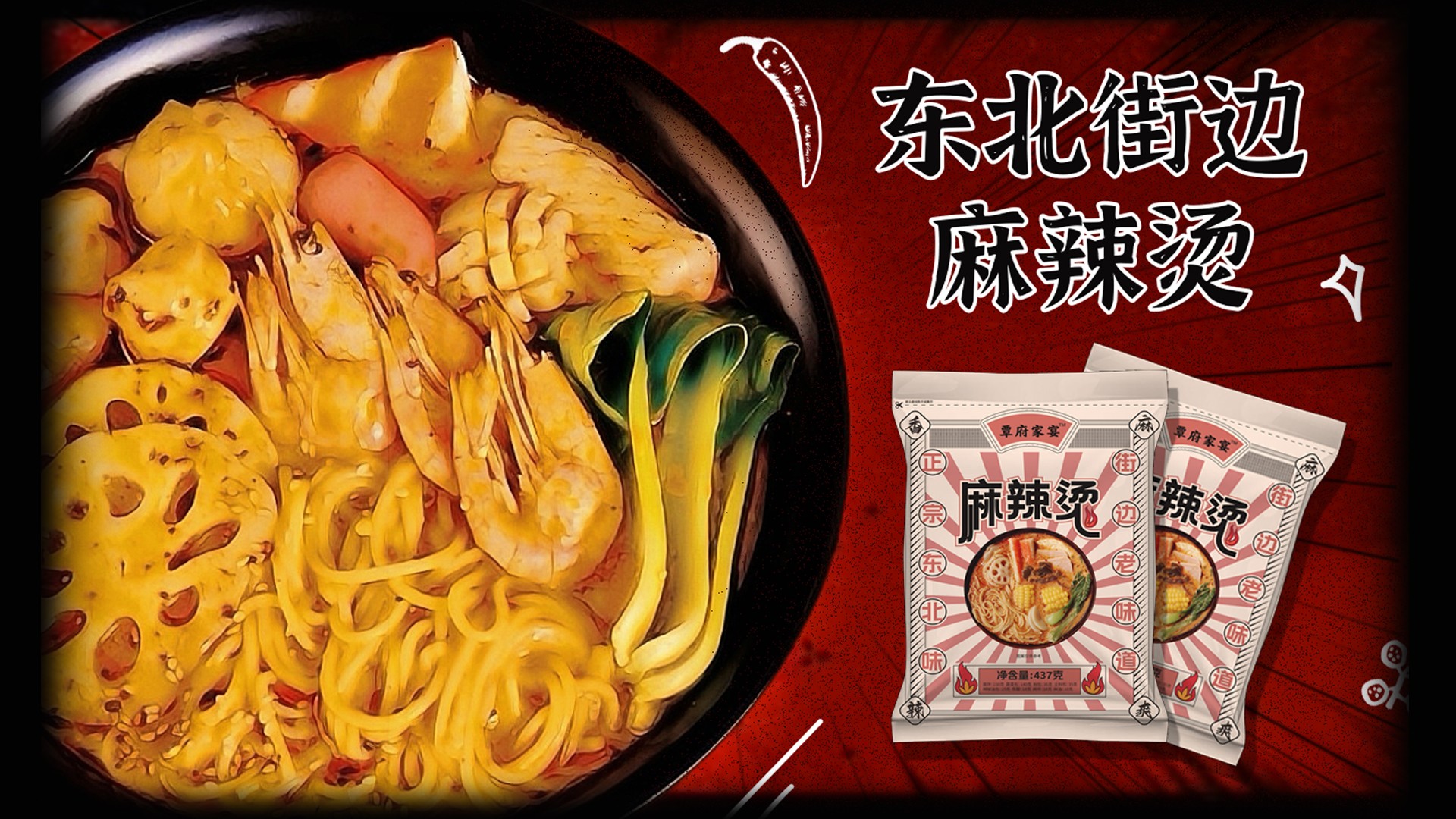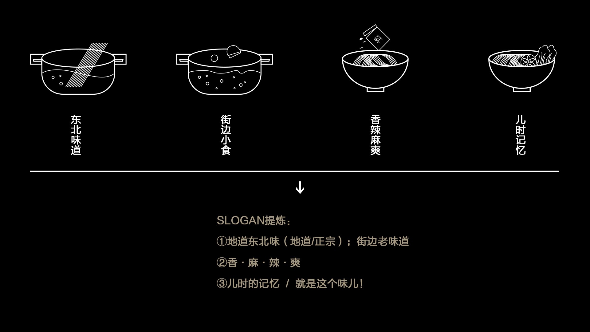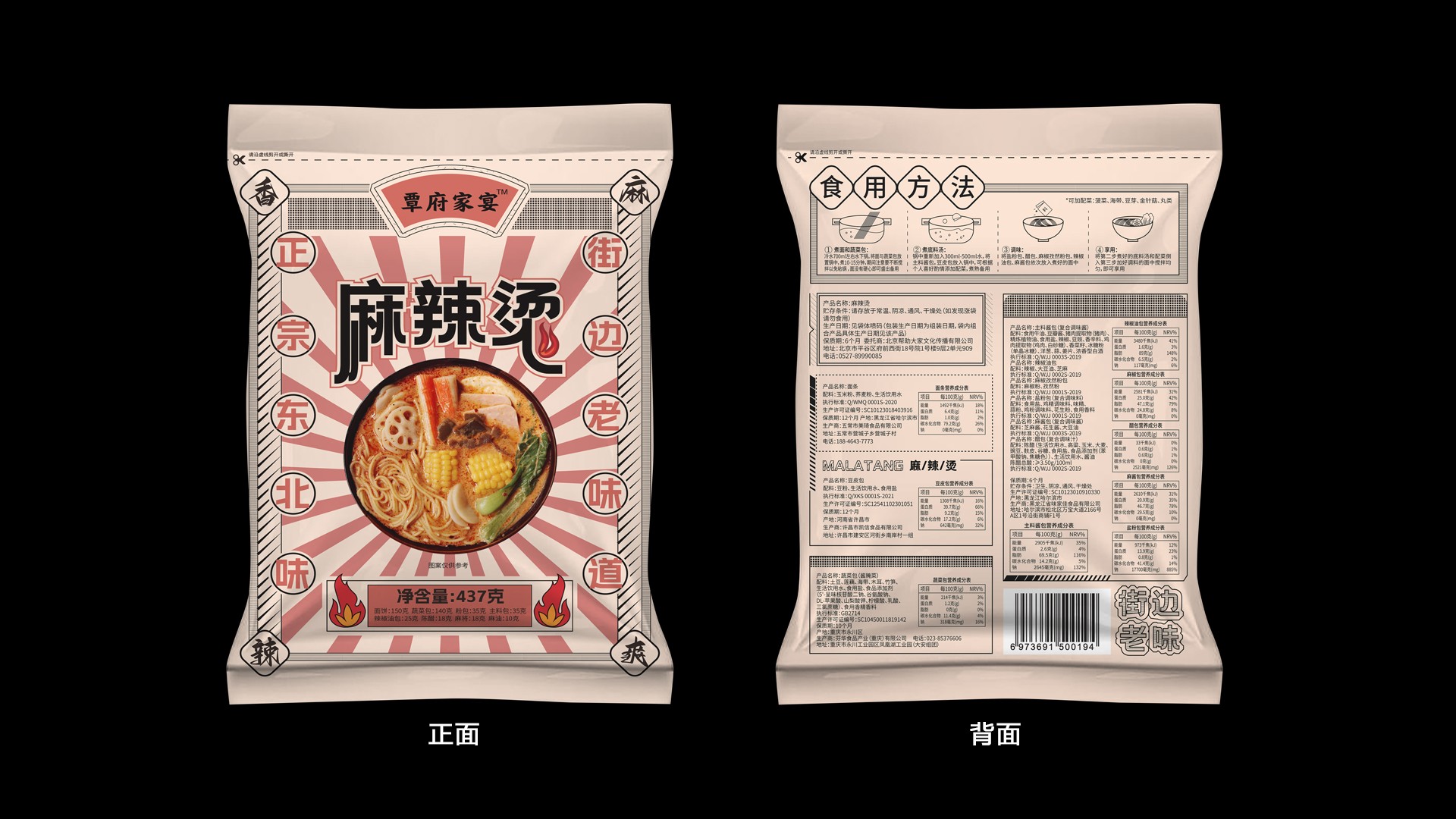 东北老式街边麻辣烫,追寻童年记忆,是怀旧的复古风在版式上,有明显的对称美学,所以包装整体居中排版,对称设计图案设计上用高图版率的实物照片,增加食欲感文字设计,为与图案更好融合,减少版面留白,做拱式变形色彩上的怀旧感用黄色牛皮色来表现纸张印刷泛黄的时代感,其他色彩也向黄色做融合。