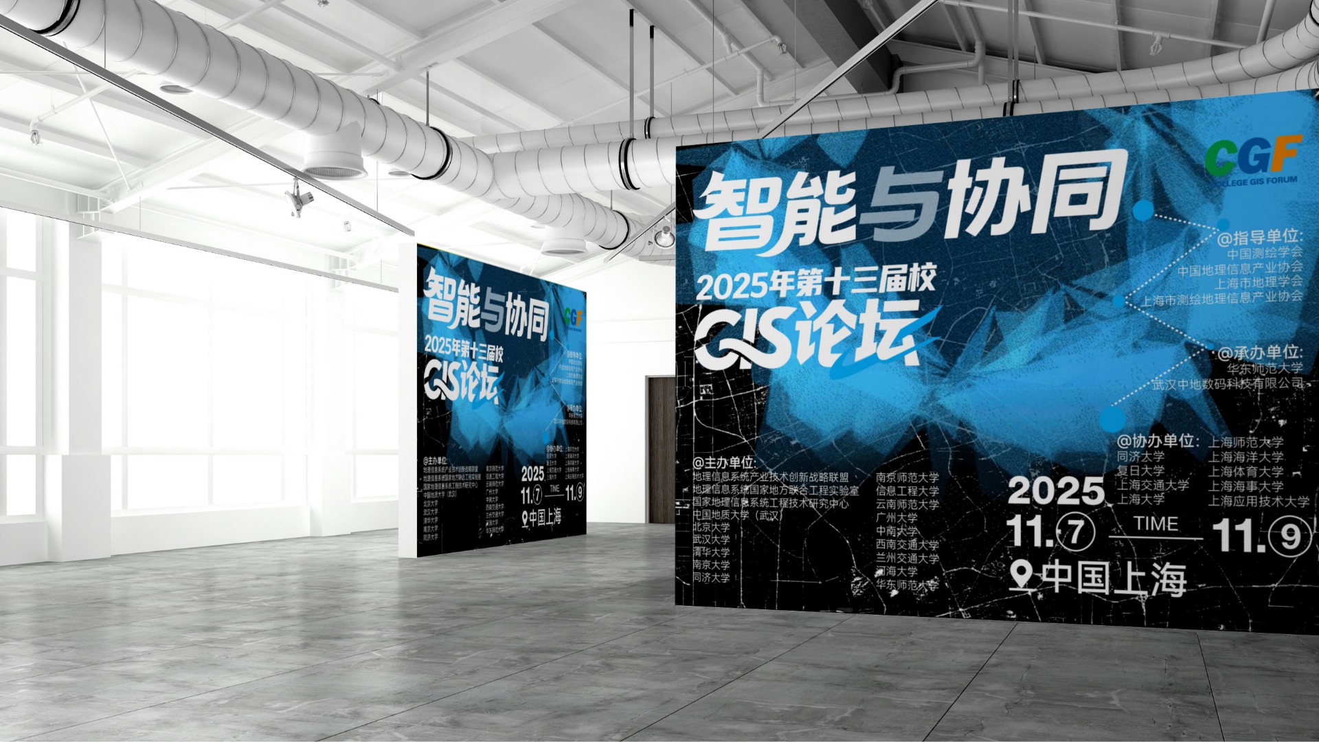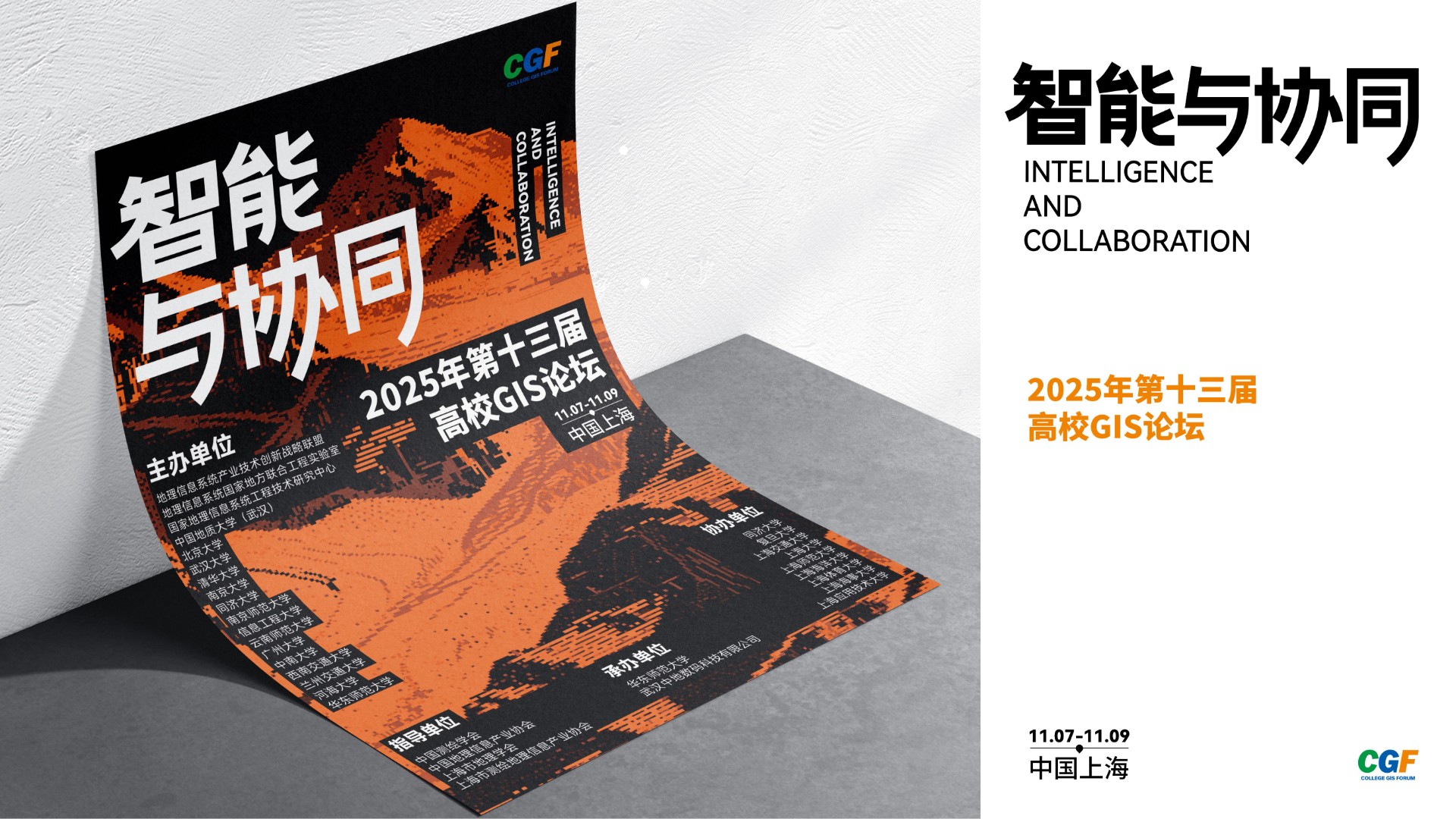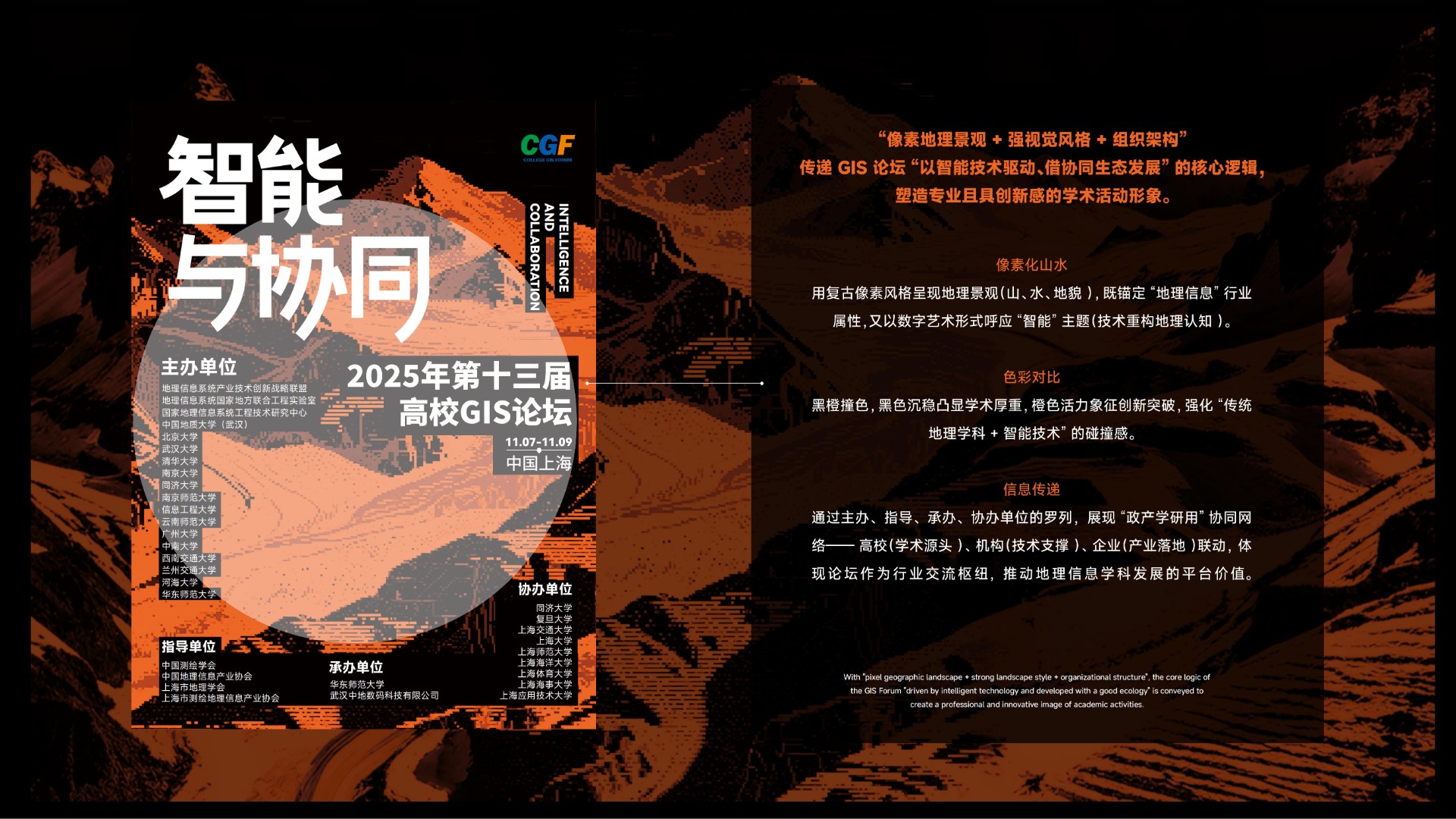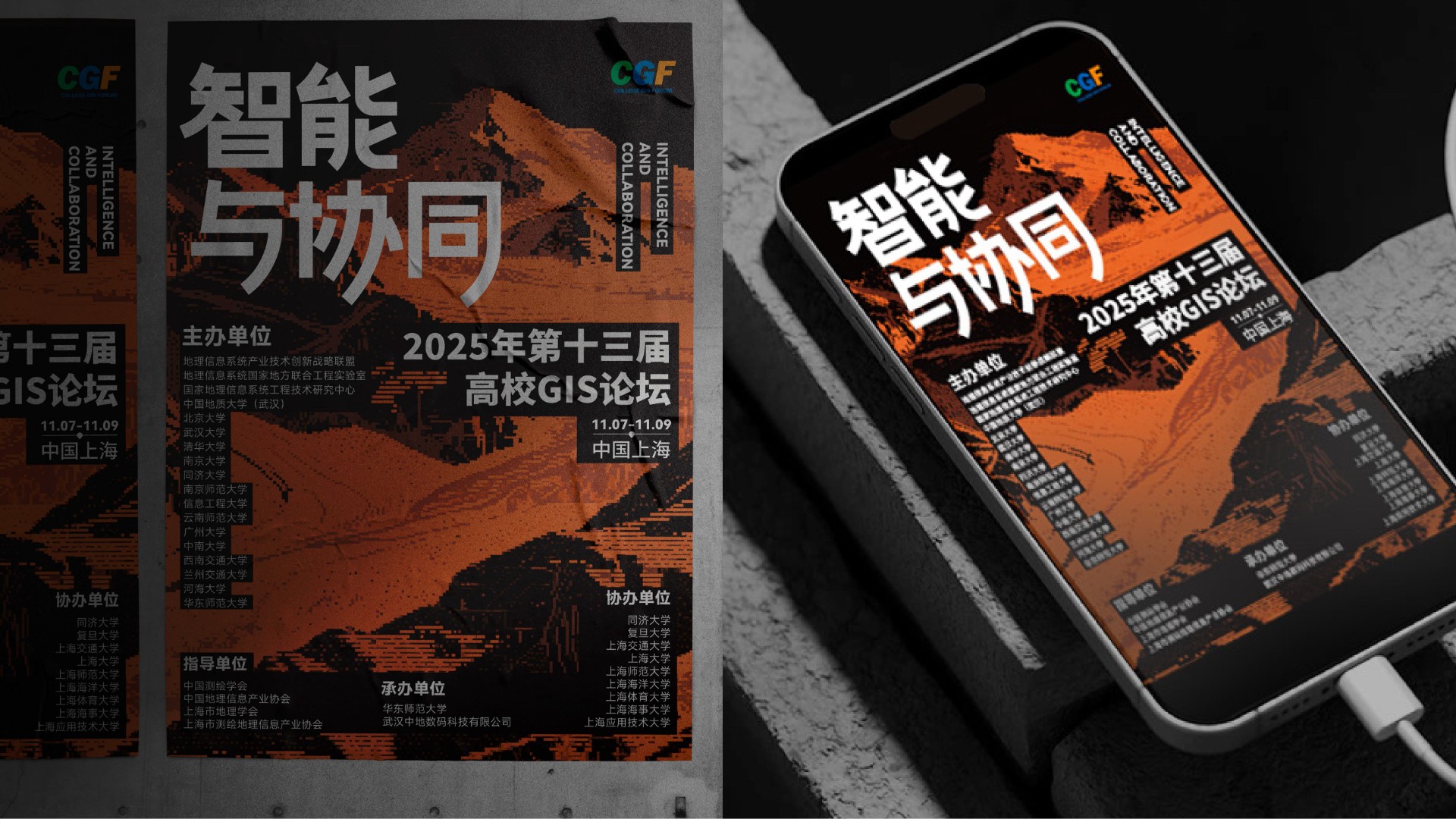2025年第十三届高校GIS论坛主KV设计以"智能与协同"为核心主题,深度契合地理信息产业智能化升级与多领域融合的发展趋势。设计通过现代科技感的视觉表现,突出展现AI技术与空间数据的创新结合,强调产学协同与跨领域资源整合的行业动向。主视觉系统不仅承载着提升会议专业形象的重要使命,更致力于打造具有高度识别性的品牌符号,为会议宣传、数字传播、会场导视等全场景应用提供强有力的视觉支撑,有效传递中国地理信息产业的前沿发展与创新活力。