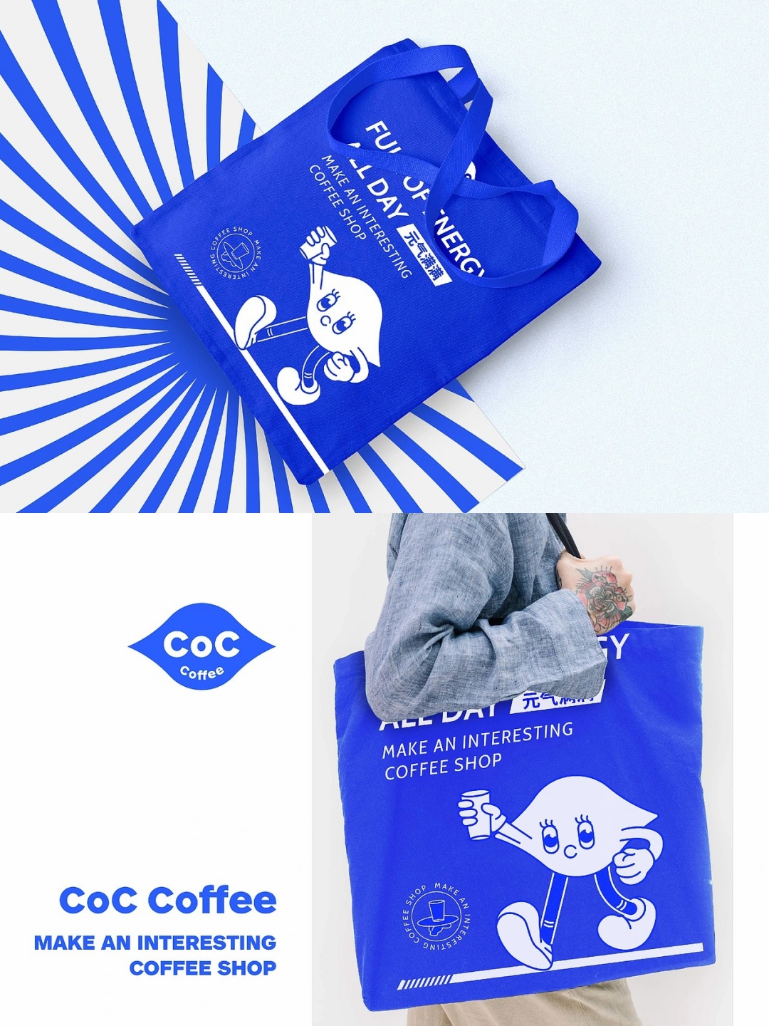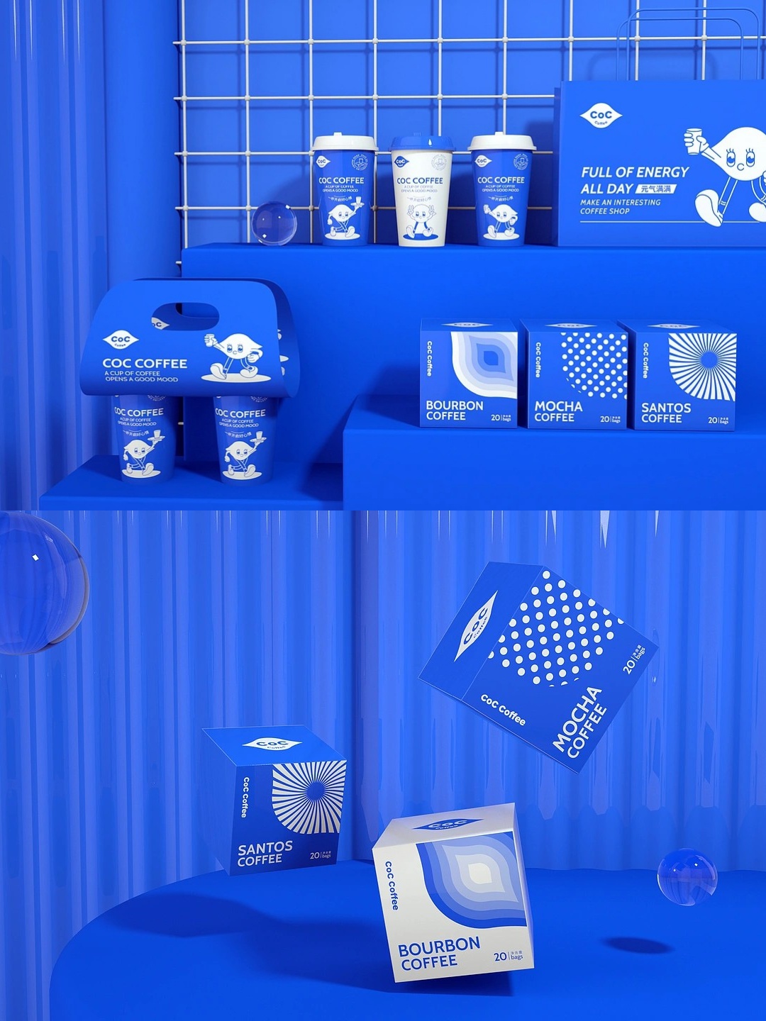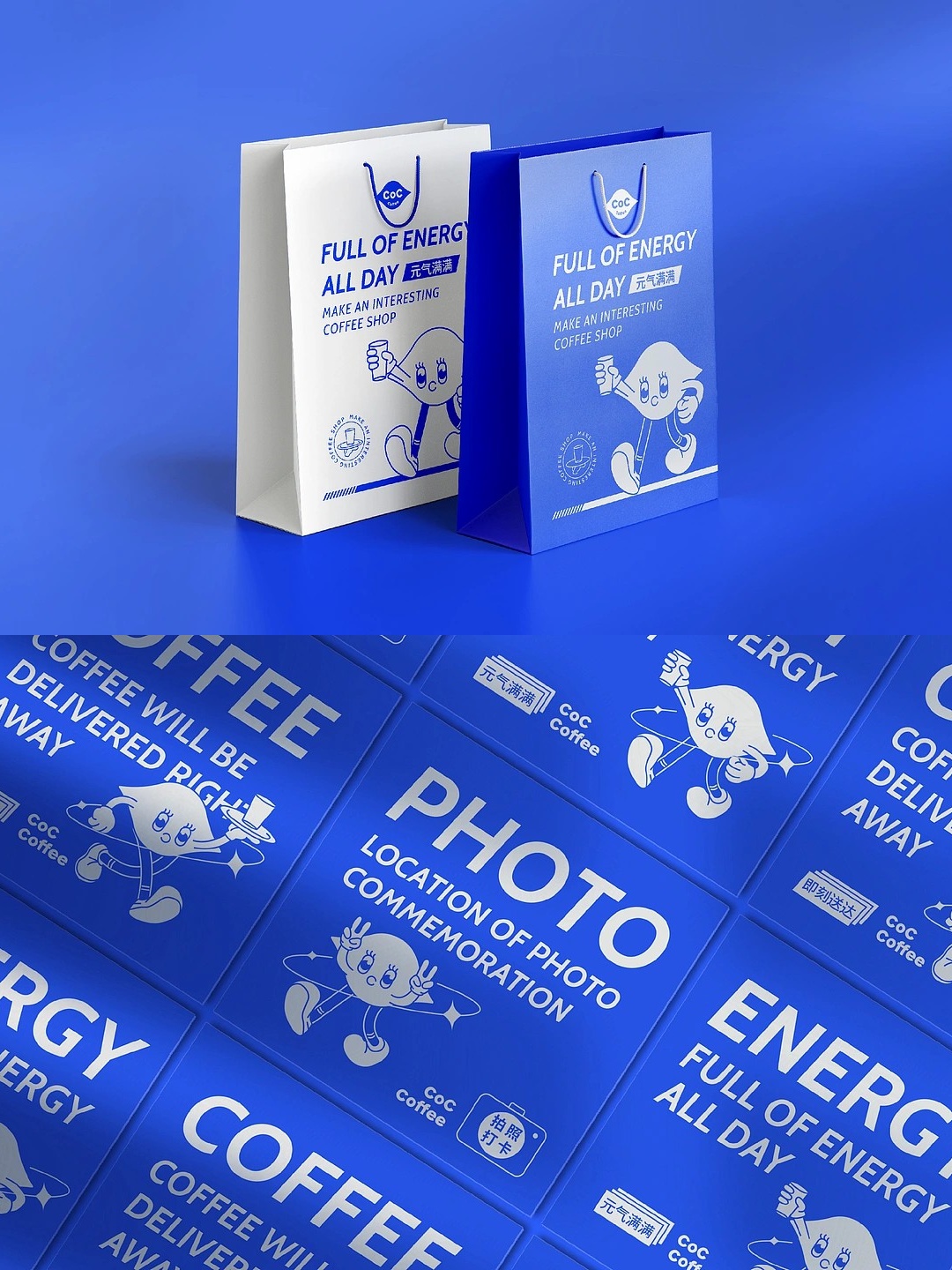 以明亮的蓝色为主色调,搭配可爱又有辨识度的卡通形象,瞬间抓住眼球~从咖啡杯、打包袋到各类周边,整体设计风格统一且充满趣味,人们生活节奏急速,现代人的生活压力庞大,越来越多人更关注个人健康,咖啡作为上班族的醒神产品,除了醒神作为早餐还很便捷,无疑成为当下一种主流消费。CoC Coffee是一家小众的咖啡品牌店,我们希望我们能温暖每一个积极向上的年轻人,让彼此能在这座喧嚣的城市中找到自己内心的方向,我们专注于咖啡的品质和体验,让您感受到不一样的温暖和安心